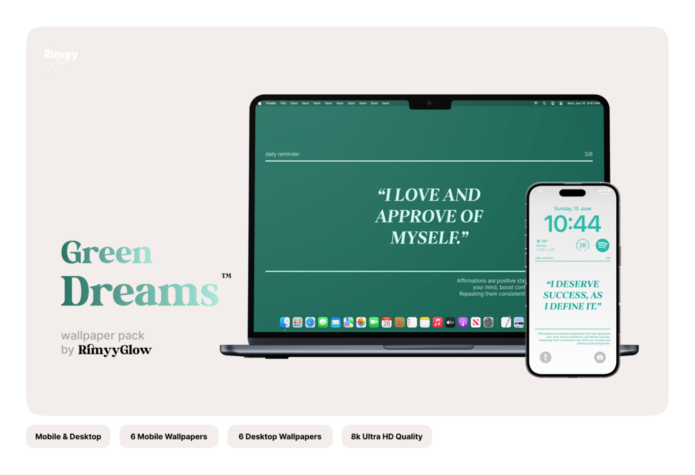 Green Dreams™ is a premium affirmation wallpaper pack designed to calm your mind and elevate your digital space.